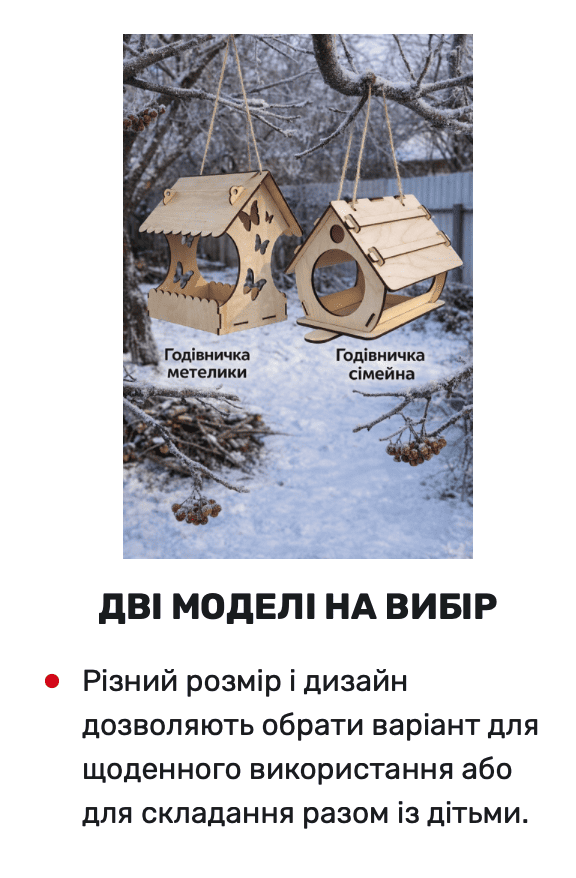 Обидві годівнички постачаються у розібраному вигляді, легко збираються, не потребують спеціальних інструментів і цікаво збирати як самостійно, так і разом із дітьми.
