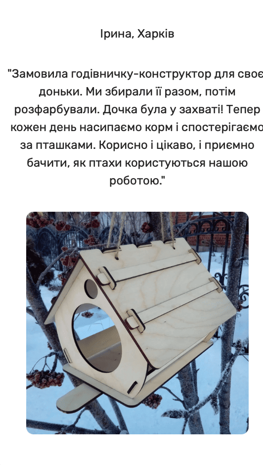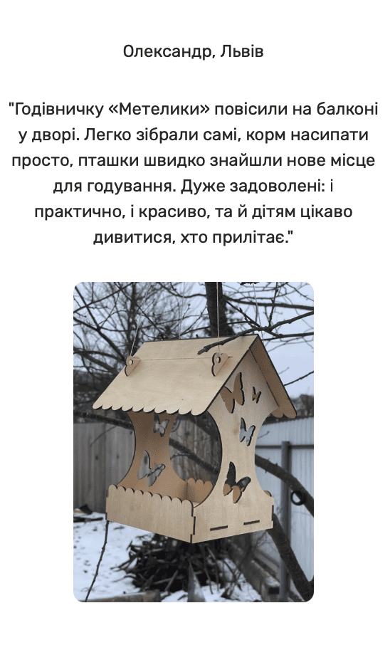 Особлива перевага даної годівниці з фанери полягає у її конструкції та розмірах, спроектованих для забезпечення безпеки птахів від потенційних хижаків та інших загроз. Матеріал виготовлення, фанера, є екологічно чистим, що робить цю годівницю безпечною для птахів та навколишнього середовища.