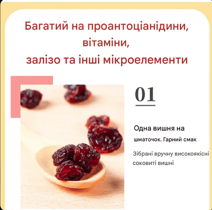 Приємно здивований! Справжній смак вишні, не пересушена, дуже корисний перекус